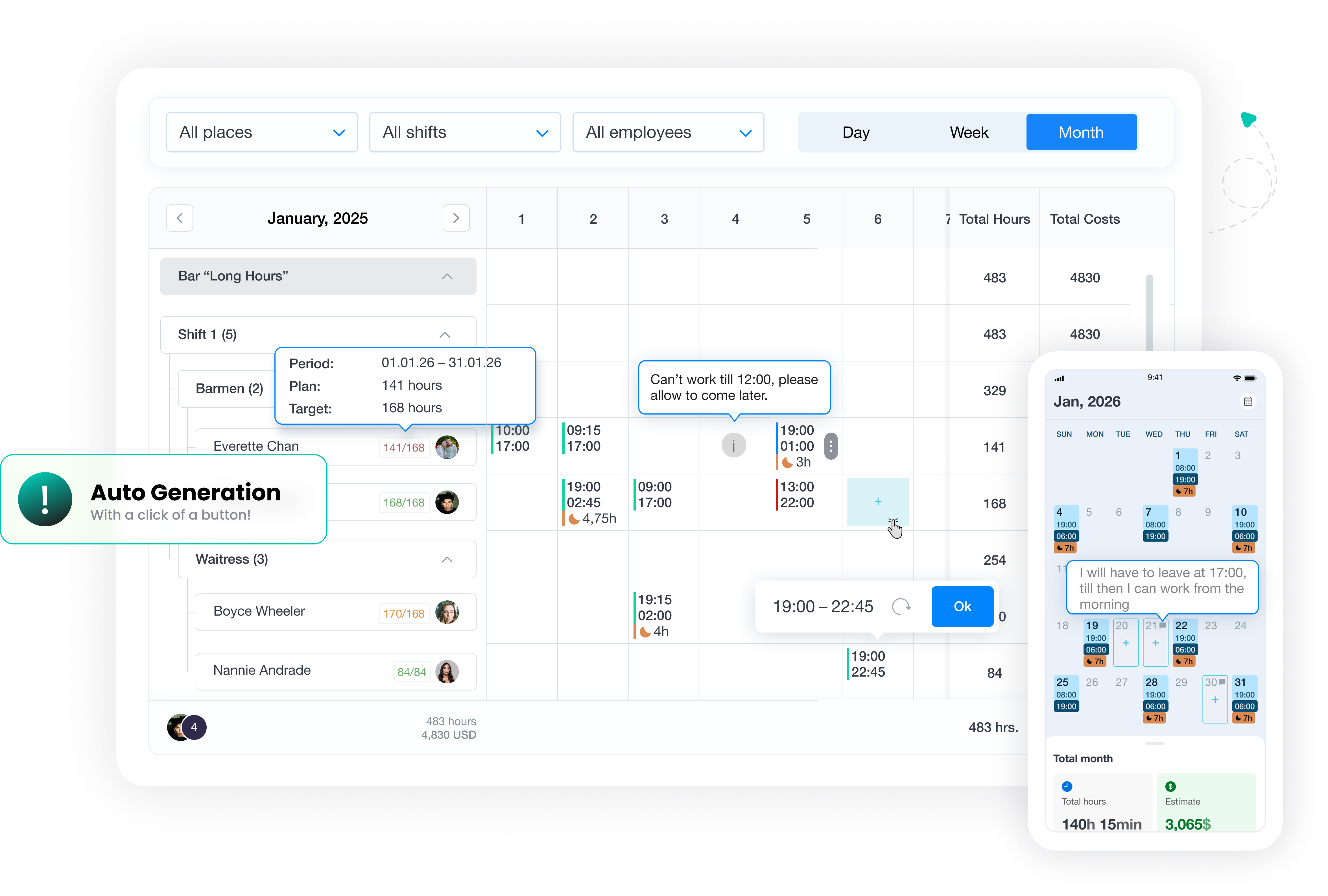 Generate shifts in one click using your scheduling rules, recurring patterns, and staffing structure. Managers get a working draft for the full schedule period faster, then adjust shifts manually wherever business conditions require changes.