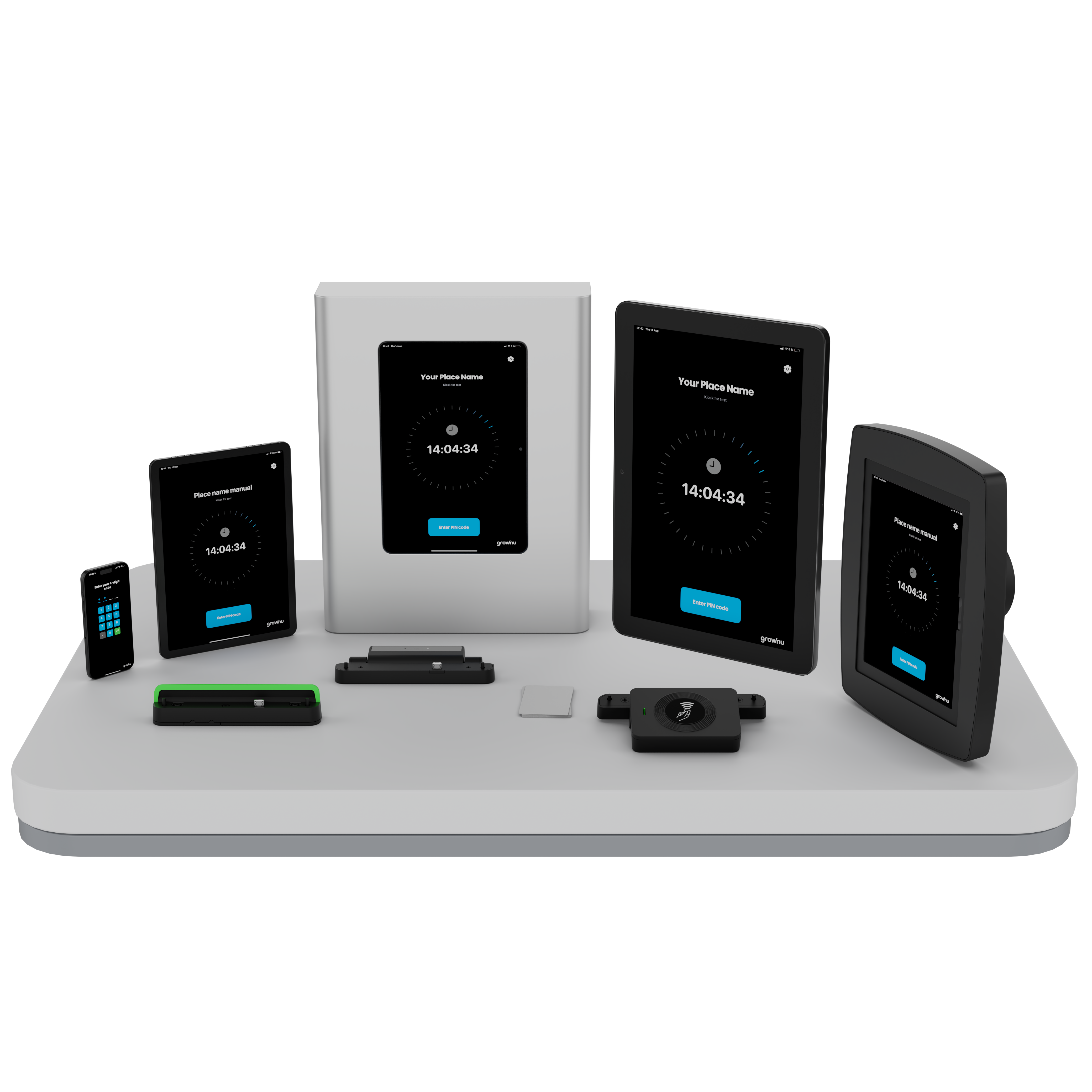 Grownu offers multiple time & attendance terminal options—from a free mobile app time clock to RFID badge terminals, weatherproof outdoor units, and secure wall mounts. Pick the setup that fits your site, workforce, and compliance needs.